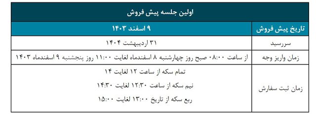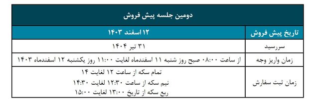 براین اساس و در این مرحله سکه های پیش فروش شده با دو تاریخ سررسید ۳۱ اردیبهشت ماه ۱۴۰۴ و ۳۱ تیرماه ۱۴۰۴ به متقاضیان محترم عرضه می شود.