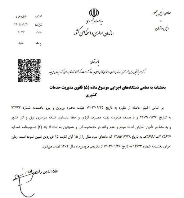 به گزارش ایسنا، سازمان اداری و استخدامی اعلام کرد که مطابق بخشنامه مذکور، ساعت کاری ادارات دولتی در واحدهای ستادی - دستگاههای اجرایی ملی - مستقر در شهر تهران از ساعت ۸ تا ۹ صبح به صورت شناور و ساعت خاتمه کار نیز از ساعت ۱۴ تا ۱۵ به صورت شناور خواهد بود و همچنین ساعت آغاز به کار دستگاههای اجرایی در واحدهای استانی ساعت ۸ صبح و خاتمه کار ساعت ۱۴ تعیین میشود.