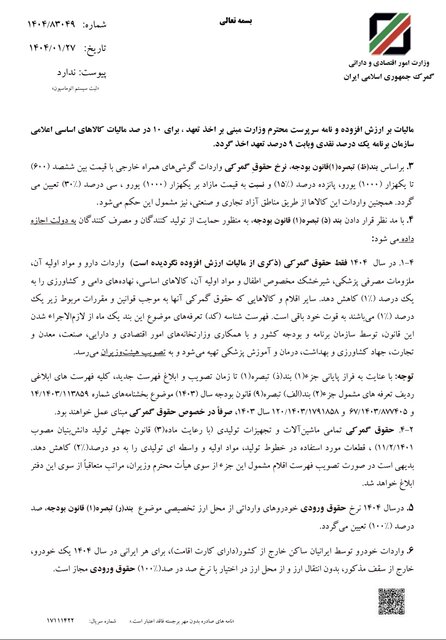 بر اساس بند ۵ این ابلاغیه، تاکید شده که در سال ۱۴۰۴ نرخ حقوق ورودی خودروهای وارداتی از محل ارز تخصیصی موضوع بند (ر) تبصره(۱) قانون بودجه، صد درصد (۱۰۰) تعیین میشود.