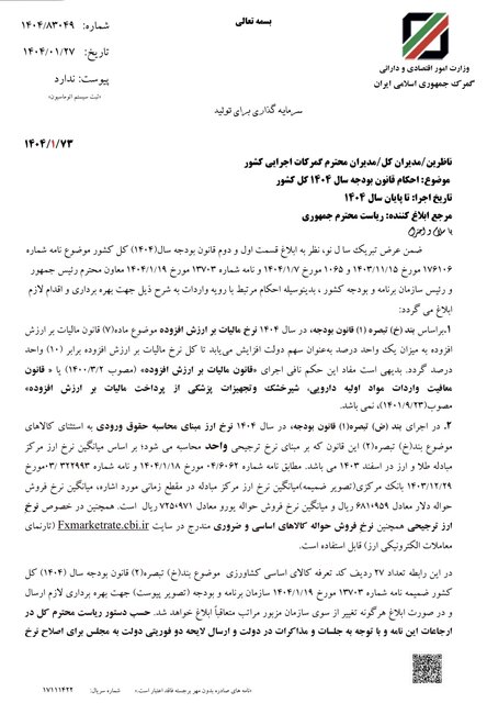 براساس ابلاغیه گمرک، نظر به ابلاغ قسمت اول و دوم قانون بودجه سال (۱۴۰۴) کل کشور، موضوع نامه شماره ۱۷۶۱۰۶ تاریخ ۱۵ بهمن ۱۴۰۳ و ۱۰۶۵ تاریخ ۷ فروردین ۱۴۰۴ و نامه شماره ۱۳۷۰۳ تاریخ ۱۹ فروردین ۱۴۰۴ معاون رئیس جمهور و رئیس سازمان برنامه و بودجه کشور، بدینوسیله احکام مرتبط با رویه واردات، بهره برداری و اقدام لازم ابلاغ میشود.