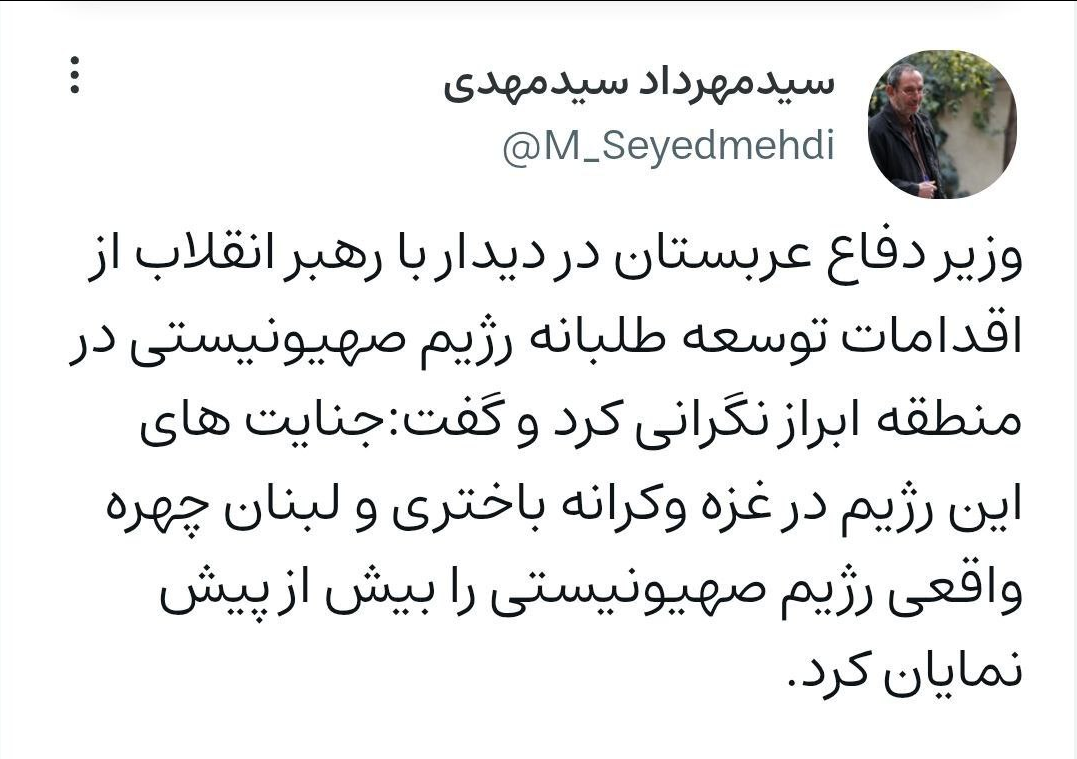 وزیر دفاع عربستان در دیدار با رهبر انقلاب از اقدامات توسعه طلبانه رژیم صهیونیستی در منطقه ابراز نگرانی کرد و گفت:جنایت های این رژیم در غزه وکرانه باختری و لبنان چهره واقعی رژیم صهیونیستی را بیش از پیش نمایان کرد.