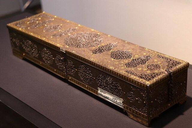 این قلمدان با ابعاد ۹ در ۳۷.۷ سانتیمتر، از گنجینه آستان قدس رضوی انتخاب شده و با شماره ثبت ۹۲۲ در فهرست آثار این مجموعه قرار دارد. اکنون این اثر بیبدیل برای نخستینبار در نمایشگاه «فرنود هشت» در موزه ملی ملک به نمایش درآمده و در معرض دید علاقهمندان هنرهای فلزی و خوشنویسی قرار گرفته است.