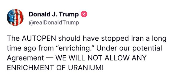 ترامپ پیشتر نیز بر توقف غنیسازی اورانیوم در خاک ایران تاکید کرده بود؛ موضوعی که هر بار با مخالفت قاطع مسئولان کشورمان مواجه شده است.