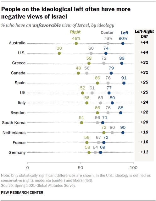 از منظر سیاسی نیز، در اکثر کشورهایی که این سؤال مطرح شده، کسانی که خود را به جناح چپ سیاسی نزدیک میدانند، بیشتر از جناح راست دیدگاه منفی دارند. در استرالیا، برای نمونه، ۹۰ درصد چپگرایان و تنها ۴۶ درصد راستگرایان نظر منفی نسبت به رژیم صهیونیستی دارند. همین الگو در ایالات متحده نیز با شدت بیشتری مشاهده میشود.