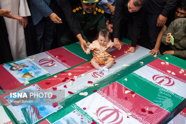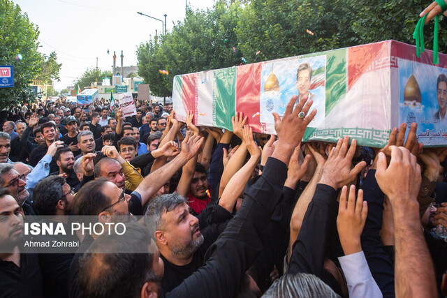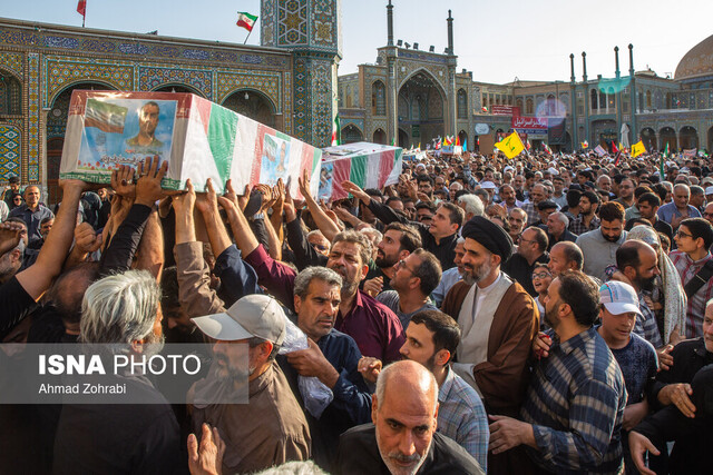 پیکرهای پاک شهیدان سرهنگ پاسدار عارف معارفوند، سرهنگ دوم پاسدار محمد باقر عربشاهی، سرگرد پاسدار میثم احمدنژاد، پاسدار رشید اسلام هادی میرزایی، حاج محمد خاکی احمدآبادی، نوجوان دانشآموز شهید ذاکر اهل بیت (ع) محمد حسین خاکی احمدآبادی و خادم الرضا (ع) نوجوان دانشآموز شهید احسان قاسمی، پس از طواف بر گرد مضجع شریف بانوی کرامت و اقامه نماز توسط آیتالله حسینی بوشهری در میان طنین الله اکبر، مرگ بر آمریکا و مرگ بر اسرائیل از مسیر باغ راه انقلاب به سمت گلزار شهدای علی ابن جعفر (ع) روی دوش مردم قم تشییع شدند.