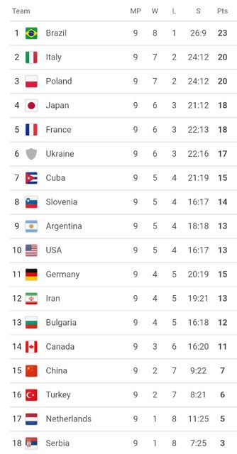 لهستان با ۷ برد و ۲ باخت در رده سوم قرار دارد و ایران با ۴ برد و ۵ باخت به مکان دوازدهم رفت.