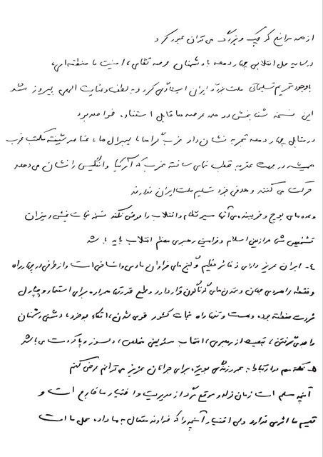 ۷. ایران عزیز دارای ذخائر عظیم و گنجهای فراوان مادی و انسانی است و از طرفی در چهارراه و نقطه راهبردی جهان و تمدنهای گوناگون قرار دارد و طمع قدرتها همواره برای استعمار و چپاول ثروت منطقه بوده و هست و تنها راه نجات کشور قویشدن اتکا به خود، دشمنی دشمنان را جدی گرفتن، تبعیت از رهبری، انتخاب مسئولین مخلص، دلسوز و پاکدست میباشد.»