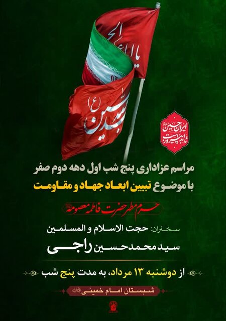 مراسم عزاداری پنج شب اول دهه دوم صفر با موضوع «تبیین ابعاد جهاد و مقاومت» و با سخنرانی حجت‌الاسلام و المسلمین سید محمدحسین راجی، در حرم حضرت معصومه(س) برگزار می‌شود.