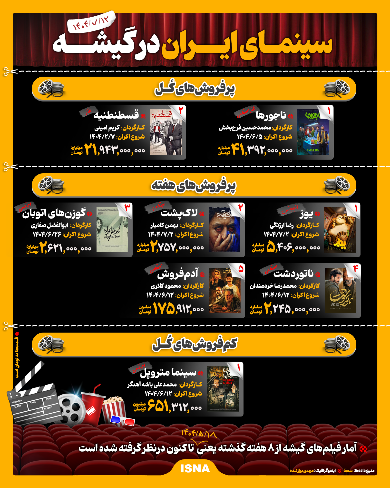 دو فیلم سینمایی «ناجورها» و «قسطنطنیه» از زمان اکران روی پرده سینما تا صبح امروز، عنوان پرفروشترین فیلمها را برای خود ثبت کردهاند. آمار فیلمهای گیشه از ۸ هفته گذشته یعنی (۱۸ مرداد) تا کنون درنظر گرفته شده است. طبق آئیننامه اکران فیلمهای سینمایی، میزان فروش فیلمها در بازه زمانی هشت هفته از شروع اکران بررسی میشود و با اضافه شدن چند فیلم به سرگروهها، فیلمهایی که مدت زمان اکران آنها تمام شده از لیست سرگروهی حذف شده و جای خود را به فیلمهای جدید میدهند.