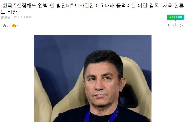 سایت اینتر اسپورت کره جنوبی نوشت: در حالی که قلعهنویی ادعا کرده پس از شکست ۵ بر صفر کره برابر برزیل سرمربی کره تحت فشار نبوده، وضعیت فعلی این را نشان نمیدهد. هونگ میونگ بو، مربی تیم، به دلیل استفاده از خط دفاعی سه نفره و شکست پنج گله مقابل برزیل بسیار مورد انتقاد قرار گرفت. انتقادات نه تنها به دلیل شکست پرگل بلکه به دلیل عملکرد ضعیف فوتبال کره در حال افزایش است.