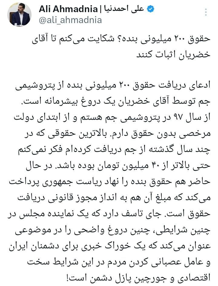 «حقوق ۲۰۰ میلیونی بنده؟ شکایت میکنم تا آقای خضریان اثبات کنند. ادعای دریافت حقوق ۲۰۰ میلیونی بنده از پتروشیمی جم توسط آقای خضریان یک دروغ بیشرمانه است. از سال ۹۷ در پتروشیمی جم هستم و از ابتدای دولت مرخصی بدون حقوق دارم.»