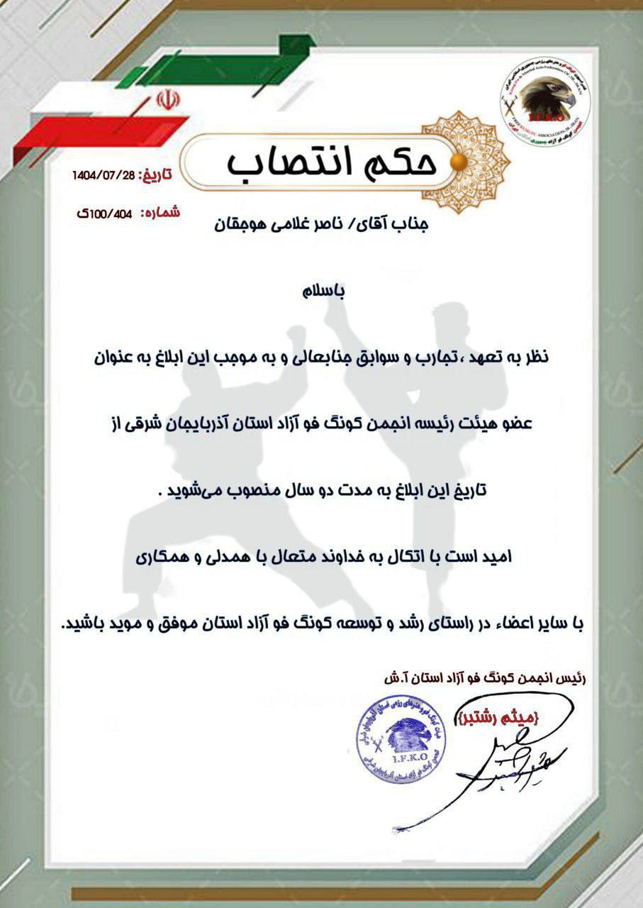 به گزارش ایسنا، با حکم میثم رشتبر، رئیس انجمن کونگ فو آزاد استان آذربایجان شرقی، ناصر غلامی هوجقان به این سمت منصوب گردید. این حکم در نشستی با حضور برخی از اعضای این انجمن اهدا شد.