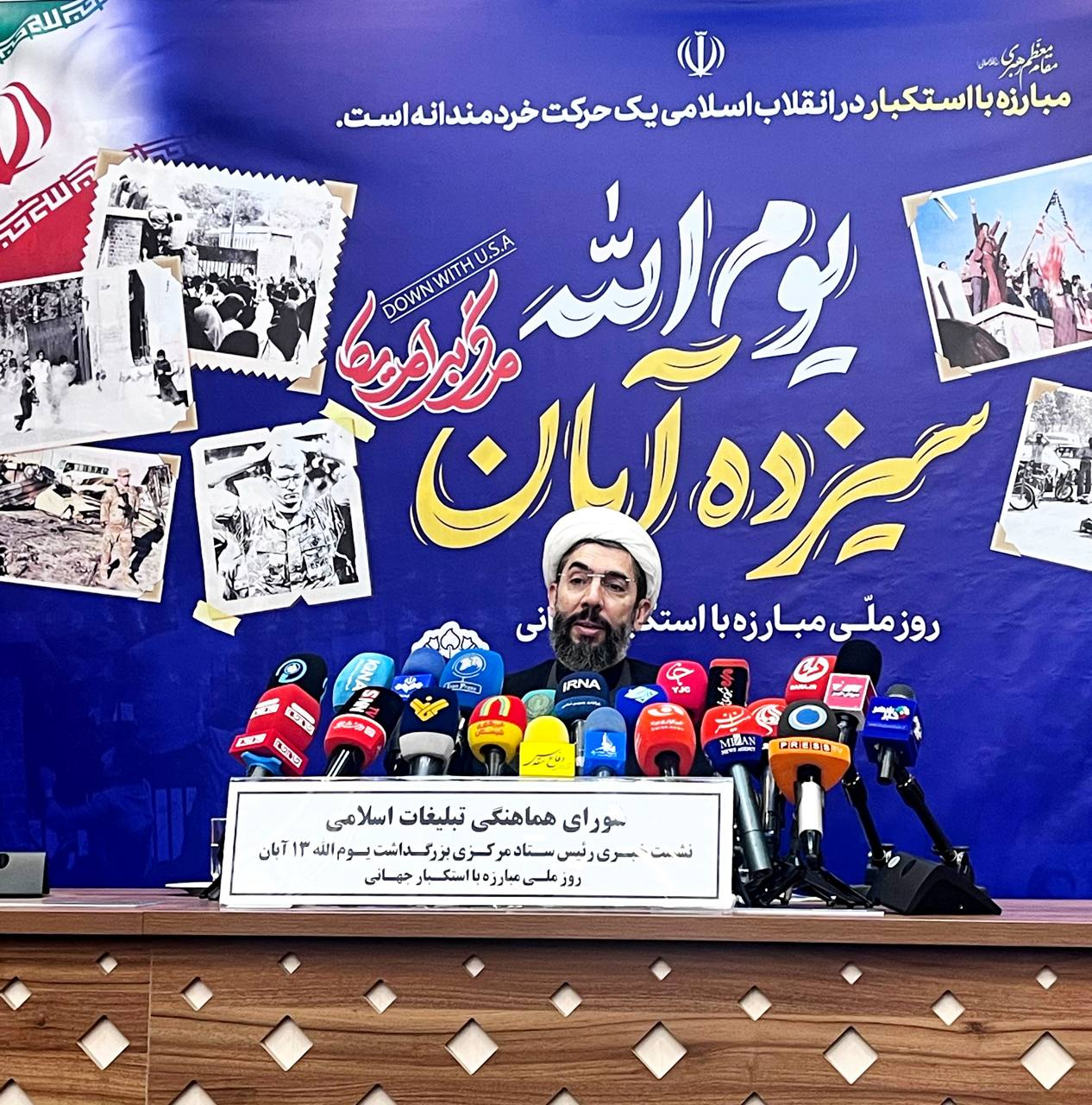 وی تصریح کرد: زنگ استکبارستیزی در تمام مدارس کشور در صبح روز ۱۳ آبان نواخته خواهد شد. بیش از ۴۵۰۰ رسانه و خبرنگار در سراسر کشور مراسم این روز را پوشش خبری میدهند و خانواده مدافع حرم و شهدای جنگ ۱۲ روزه و تشکلهای دانشآموزی در این روز حضور دارند. همچنین برای تسهیل خدمت رسانی و راهپیمایان هماهنگیهایی لازم با شهرداری تهران (مترو و اتوبوسرانی) انجام گرفته است و ایستگاههای خدماتی و فرهنگی هم در طی مراسم حضور برپا هستند. مراسم راهپیمایی از ساعت ۹ صبح روز سهشنبه از میدان فلسطین به سمت خیابان طالقانی و لانه جاسوسی انجام میشود.