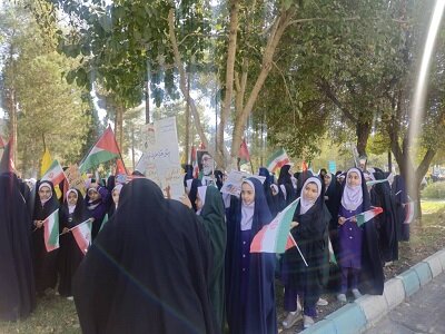 در ادامه مسیر، دانشآموزان با در دست داشتن پرچمهای جمهوری اسلامی ایران، فلسطین، حزبالله لبنان و حمل پلاکاردهایی با شعارهای انقلابی، مسیر راهپیمایی را تا مصلای بزرگ امام علی (علیه السلام) طی کردند.