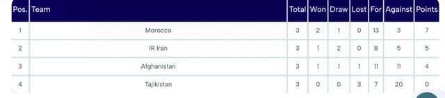 شاگردان وحید شمسایی در مرحله گروهی این رقابتها برابر مراکش و افغانستان به تساوی ۲ بر ۲ دست یافتند. در دیگر دیدار امروز این گروه، مراکش با چهار گل برابر افغانستان پیروز شد و با ۷ امتیاز به عنوان صدرنشین راهی دور بعد شد.