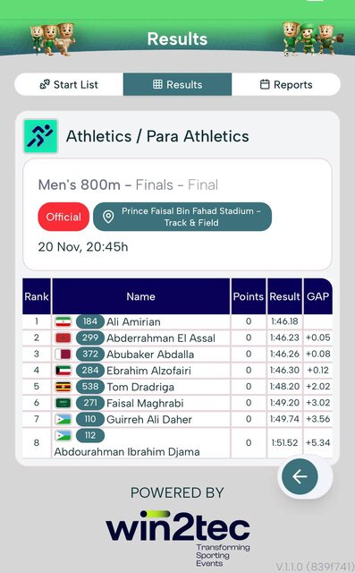 دونده ایران رکورد ۱:۴۶.۱۸ دقیقه را ثبت کرد و به مدال طلا دست پیدا کرد.