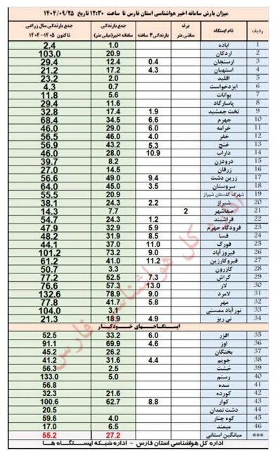 حسینی در ادامه سخنان خود بیشترین میزان بارش استان فارس تا در طی فعالیت سامانه بارشی فعلی تا ساعت ۱۲:۳۰ ظهر امروز سهشنبه، ۲۵ آذر را لامرد با میزان ۷۸.۹ میلیمتر اعلام کرد و گفت: همچنین فیروزآباد با ۷۳.۲ میلیمتر بارندگی، اوز با ۶۹.۹ میلیمتر و کوار با ۶۲.۹ میلیمتر بیشترین میزان بارشها را داشتهاند.