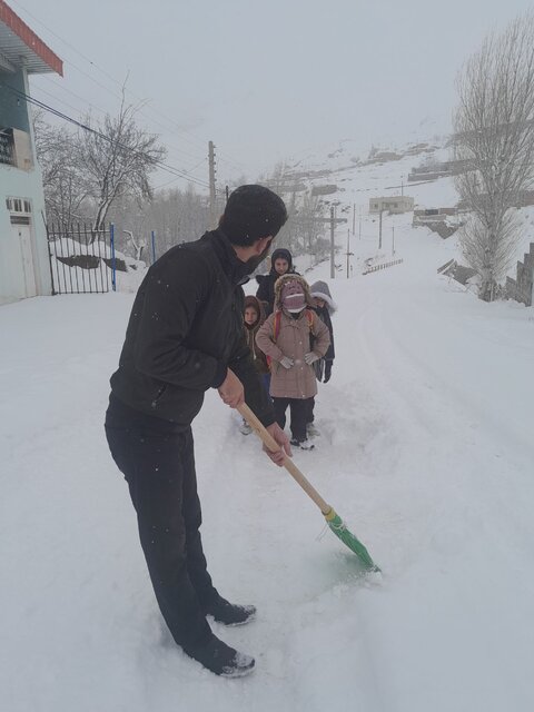 او با درک اهمیت حضور دانشآموزان در کلاس درس و با وجود سختیهای فراوان ناشی از بارش برف، از ساعات اولیه صبح با پارو مسیر دسترسی به مدرسه را هموار کرد و با تلاش بیوقفه و با صرف انرژی زیاد، انباشتگی برف را از بین برده و مسیری امن و هموار برای عبور دانشآموزان ایجاد کرد.