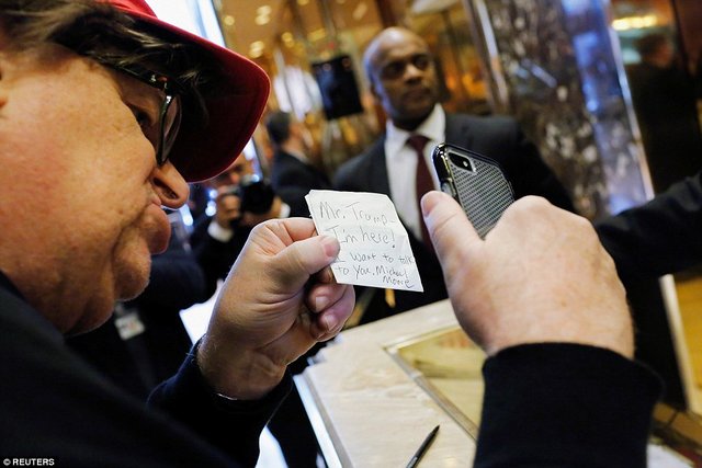 مایکل مور در فیسبوک خود نوشت: من توانستم وارد برج ترامپ شوم و پیامی را به او تحویل دهم: تو باختی. کناره گیری کن. ماموران سرویس مخفی یادداشتی را که من نوشتم گرفته و رفتند که آن را تحویل او بدهند.