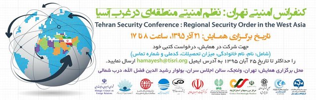 نخستین کنفرانس امنیتی تهران با موضوع «نظم امنیتی منطقهای در غرب آسیا» و با حضور اندیشمندان فعال در حوزه نظم امنیتی منطقه از کشورهای مختلف با هدف شناخت منطقه و ارائه تحلیل دقیق از آن، تولید و تقویت ادبیات فکر و ایده، مشارکت در تصمیم سازی، موجه سازی - اجماع سازی و آینده پژوهی نظم امنیتی خاورمیانه برگزار شده است .