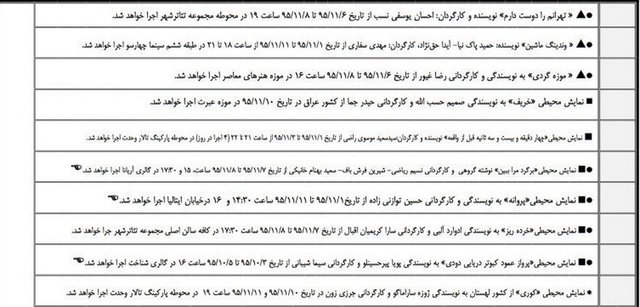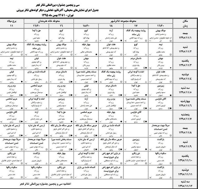 همچنین تعدادی نمایش دیگر در پردیس سینمایی چارسو، موزه هنرهای معاصر، موزه عبرت، گالریهای آریانا و شناخت، کافه سالن اصلی تئاترشهر، خیابان ایتالیا و محوطه پارکینگ تالار وحدت اجرا خواهد شد.