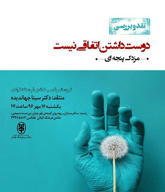 به گزارش ایسنا بر اساس خبر رسیده، نشست نقد و بررسی مجموعه شعر «دوست داشتن اتفاقی نیست» سروده مزدک پنجه‌ای ساعت ۱۷ یکشنبه ۱۶ مهر ۹۶ با حضور  دکتر سینا جهاندیده در خانه فرهنگ گیلان برگزار می‌شود.