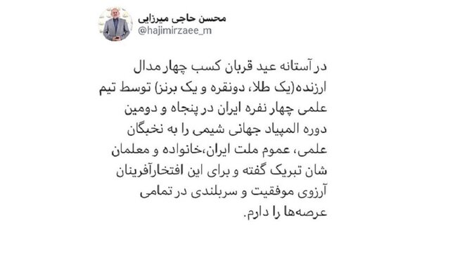 به گزارش ایسنا، محسن حاجی میرزایی درتوییتر خود با اشاره به افتخار آفرینی تیم علمی ایران در المپیاد جهانی شیمی اظهار کرد: در آستانه عید قربان کسب چهار مدال ارزنده (یک طلا، دونقره و یک برنز) توسط تیم علمی چهار نفره ایران در پنجاه و دومین دوره المپیاد جهانی شیمی را به نخبگان علمی، عموم ملت ایران، خانواده و معلمان شان تبریک گفته و برای این افتخارآفرینان آرزوی موفقیت و سربلندی در تمامی عرصهها را دارم.