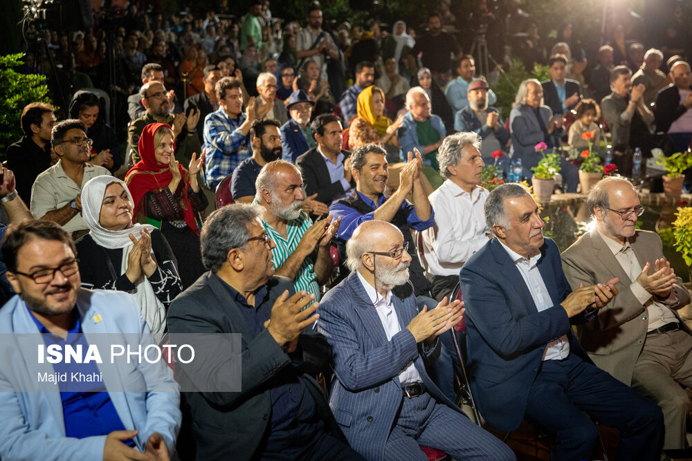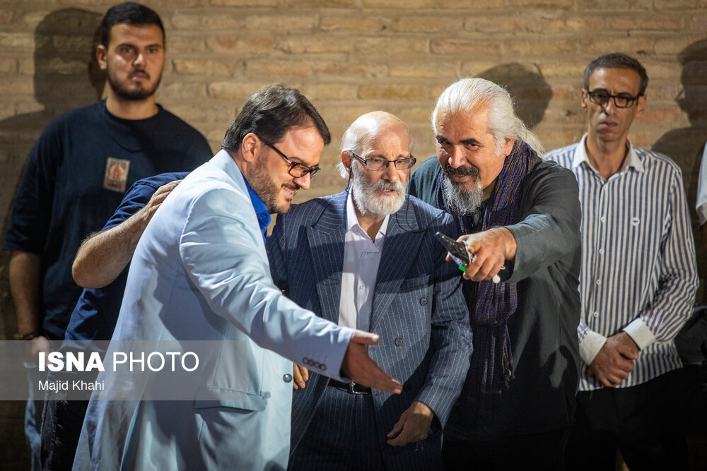 • از راست سیاوش ستاری، دبیر جشنوراه و داود فتحعلی بیگی، بازیگر در اختتامیه جشنواره نمایش‌های آیینی و سنتی
