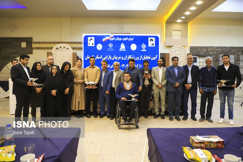 مراسم تجلیل از مربیان و قهرمانان ورزش جانبازان و توان‌یابان استان کرمان با حضور سرپرست اداره کل ورزش و جوانان استان، مدیرکل بهزیستی، روسای هیئت‌های ورزشی جانبازان و توان‌یابان و جمعی از ورزشکاران ، شامگاه ٰیکشنبه ۱۱ آبان ۱۴۰۴ در هتل ایرانگری در کرمان برگزار شد.  در پایان مراسم از مربیان، پیشکسوتان و ورزشکاران جانبازان و توان‌یابان استان کرمان از جمله پیمان نصیری، محمدرضا کریمی، بهناز قدیمی، سیداکبر دلپسند، مریم ایرانمنش، محسن باغبانی، علی قهاری، بتول خلیل‌زاده، فاطمه عباسی، سعید افروز، سیدشورش دلپسند، خلیل شهریارنسب، معصومه مولایی، سینا ضیغمی‌نژاد، سینا منشازاده و ... تجلیل شد.