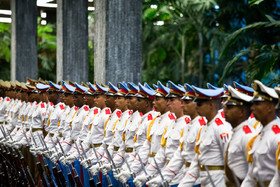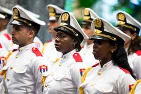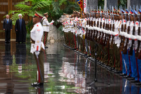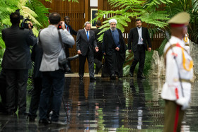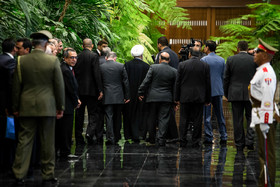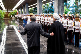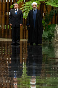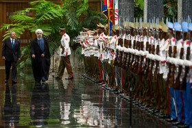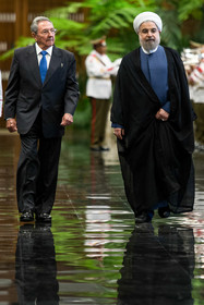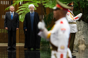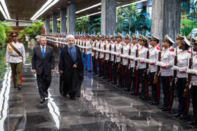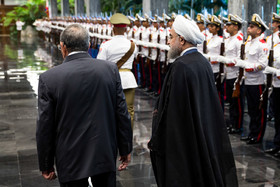 در آیین استقبال رسمی از روحانی، پس از نواخته شدن سرود ملی جمهوری اسلامی ایران و جمهوری کوبا، روسای جمهور دو کشور هیأتهای عالیرتبه همراه را به یکدیگر معرفی کردند. روحانی و رائول کاسترو بلافاصله پس از پایان مراسم استقبال رسمی وارد محل مذاکرات دو جانبه شدند.