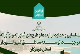 فراخوان شناسایی و حمایت از ایدهها و طرحهای فناورانه و نوآورانه در جهت توسعه مناطق کمبرخوردار با محوریت استان هرمزگان و به همت برنامه ملی توسعه اقتصاد دانشبنیان در مناطق محروم منتشر شد.